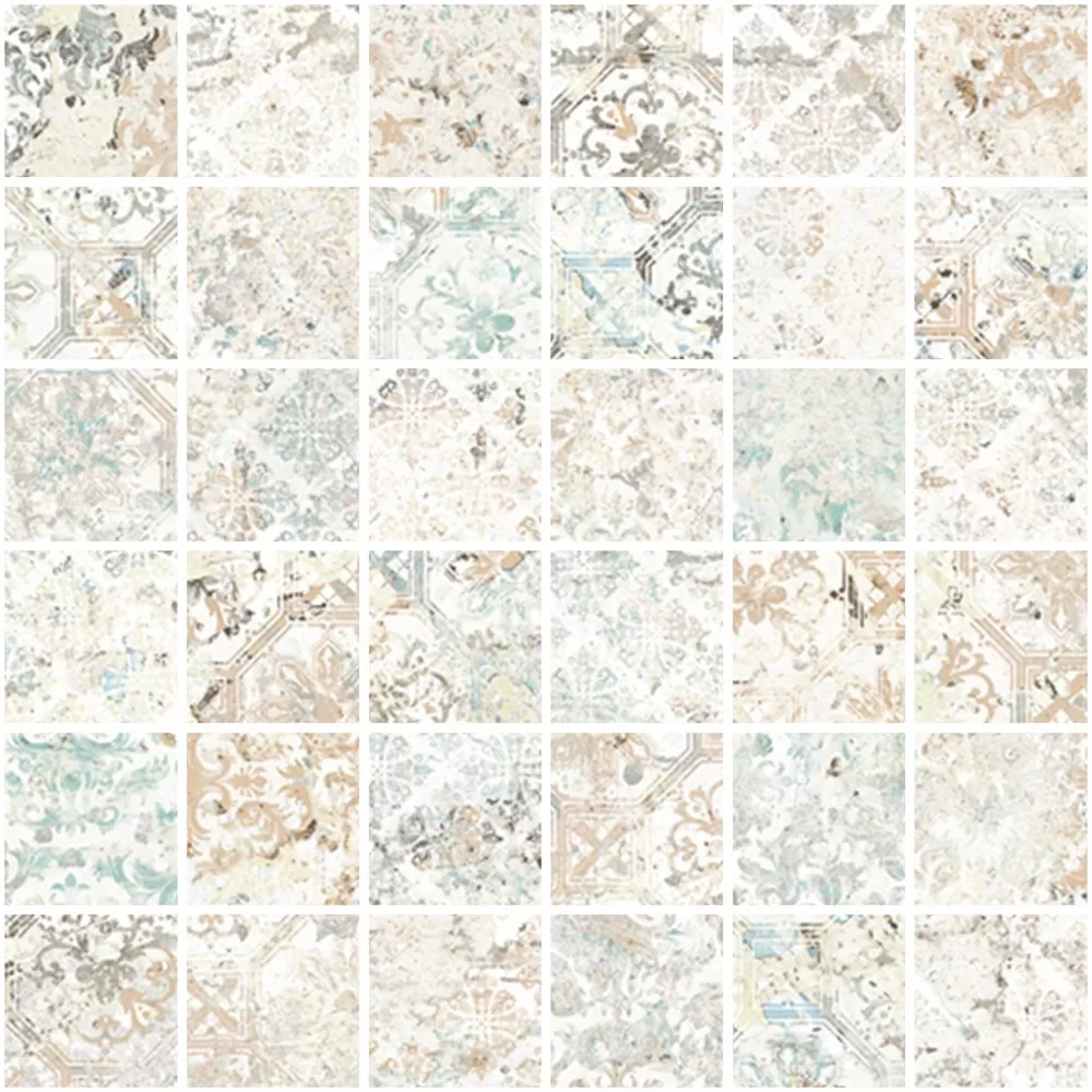 Inspired by Mediterranean rugs and carpets with vintage tones and textures.